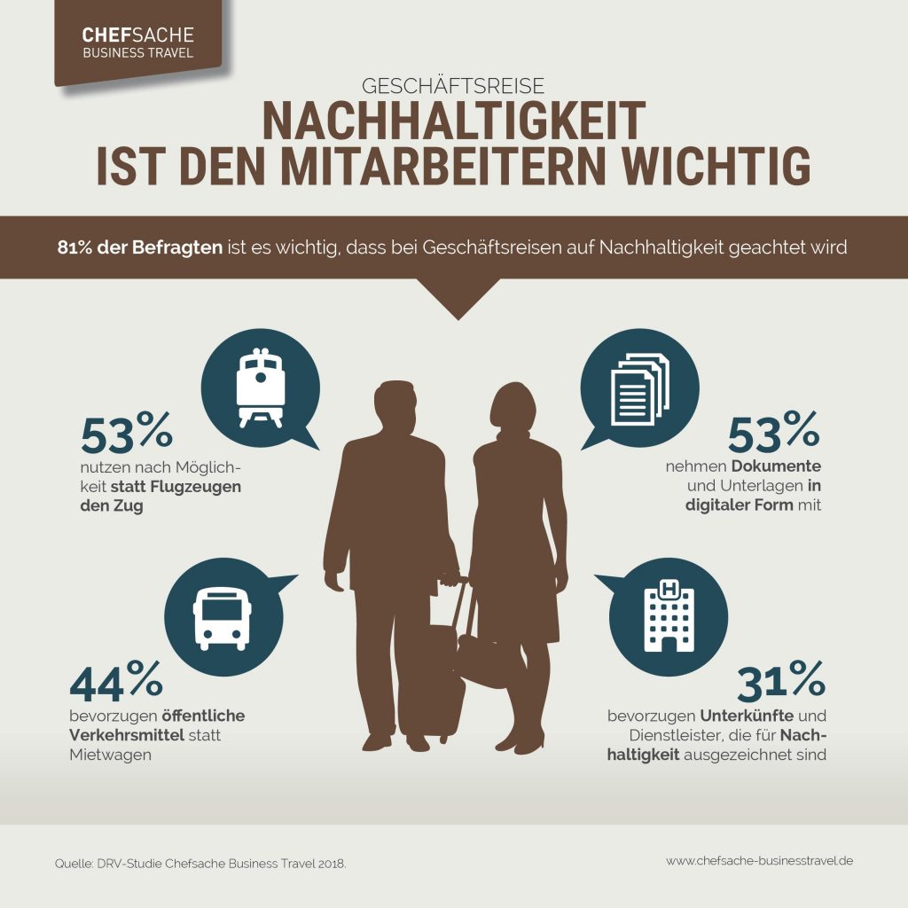 Frauen achten bei Geschäftsreisen mehr auf Nachhaltigkeit als Männer. Bei der Anreise ziehen sie den Zug häufiger als ihre männlichen Kollegen dem Flugzeug vor und nutzen am Zielort öfter die öffentlichen Verkehrsmittel. Häufig stehen aber einer nachhaltigen Geschäftsreise die Unternehmen im Weg: Obwohl dem Großteil der Befragten Nachhaltigkeit auf Geschäftsreisen wichtig ist, achtet weniger als die Hälfte der Firmen bei ihren Reiserichtlinien darauf. Das sind die Ergebnisse der aktuellen Umfrage „Chefsache Business Travel 2018“, einer Initiative von Travel Management Companies im Deutschen Reiseverband (DRV).